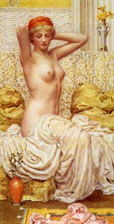 まるでイギリスの田舎のような芝の原に、背後の巨石はロゼッタストーンのようです。イギリスの古代の伝統を想起させるような風景の中に神話の牧神が、野卑な姿で現れています。その牧神は、半人半獣の野生そのものといった姿で、文化的に洗練されたものではなく、ビジネスの戦場をのし上がってきた野暮な成り上がりを象徴しているような姿です。それが上から目線で、神に見初められた清純な乙女プシュケーを見下ろします。美女と野獣です。しかも野獣に美女ひれ伏しているポーズです。その少女は金髪をロールしてまとめたヘアスタイルのイギリス人の女性に見えてきます。全裸の、その少女は裸の尻をこちらに見せています。背後から、腰から尻にかけてのラインは肉感的で、エロチックです。このようなアングルで小振りな尻を描くということは、それまでには、なかったのではないか。この部分だけを取り出せば、扇情的なヌードグラビアで、よくお目にかかるアングルです。このように記述してみると、成り上がりの成金の新興資本家に媚びているように見えてきませんか。画家本人が、そこまで自覚していたかは分かりませんが、権威となっているアカデミーの大家では決してやらない、そういうことをしたのが、この画家の新しいところとして、新興階級に受け入れられていったのでないか。『深海』(右図)という水彩画は、『パーンとプシュケ』の逆の構図です。縦長の画面は、水中で人魚が男性を海の底に引きずり込む構図です。男を深海という奈落に引きずり落とす美女です。世紀末に特有のファムファタール。ビジネスの戦場を勝ち抜き、成り上がって、功成り名を遂げた男を、妖しい美女が深みに引きずり落とす。かなりこじつけの解釈です。しかし、そう見れば、男の立場ある人に媚びていると思えませんか。ここでは、男性を抱きかかえ、身体を心持ひねるポーズは脇の下から胸を経て腰に至るサイドラインが露わになって、これもまたエロチックです。 『真鍮の塔が建設されるのを見るダナエ』(右下図)は、同じ構図、ポーズで女性はヌードになっている『ウェヌス・エピタラミア』(左図)を描いています。 これらを見ていると、バーン=ジョーンズという画家は、他のラファエロ前派の画家たちに比べて、そういう面がストレートに見えてくるのです。