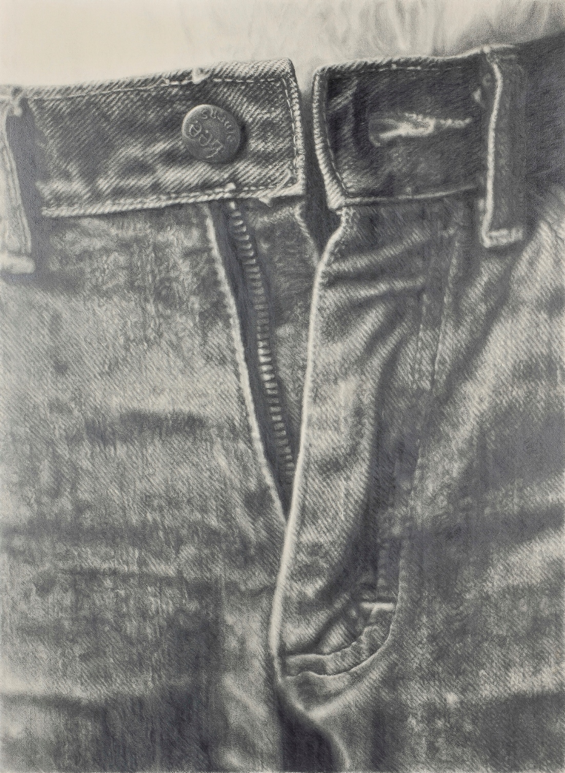 「ジーンズ」という作品。会場には、この作品の制作過程を、その画像も乗せて説明したパンフレットが配られていました。それによると、この作品は次のように制作されたということです。“1.ジーンズをモノクロ撮影し、84.0×59.0pになるように写真を引き伸ばす。2.1で用意した写真を鉄筆で2.5×2.5oのマス目を引く。各マス目の濃度を10段階に分け、濃度に応じて0から9までの数字を、マス目に書いていく。3.写真と同じサイズの方眼紙を用意して、2で書いた数字を書き写していく。4.方眼紙と同じサイズの透明フィルムを上から重ねる。5.左端から順に数字に対応する斜線をインクで引いていく。6.完成”ということです。その完成した作品を、ここで縮小した画像でみても、写真のように、あるいは写真のように写実的なドローイングに見えるということだけでしょう。その実物を見ると。会場では、マス目に数字を入れたものも展示されていましたが、改めてその細かさ、ひとつひとつのマス目に数字が漏れなく書き込まれているのをみているだけで、木が遠くなるような、めまいすら感じられるほどでした。そして、その数字に従ってマス目に線が引かれてマスごとの濃淡の差が生まれていくわけです。つまり、濃いマス目は線が稠密にひかれ、薄いマス目は線の数がすくない。いわば印刷のドットの違いのようなものです。それをマス目ひとつひとつただ斜線を引いていくというのは、根気強いというだけで済む作業ではないでしょう。そんなことを思いつくこと、しかも、そんな気の遠くなるような作業を実際に実行してしまうところに尋常でないものを感じます。それゆえにか、そう思ってみてしまうからかもしれませんが、全体として出来上がった画面は陽炎がかかったような、リアリズムというより幻想的に映る。それはまた、おそらく、この画面の出来上がり方の普通ではないところにも起因するのではないかと思います。つまり、私たちはふつう全体像を見ます。絵画というのもそれに従って制作されると思います。それには具象の抽象もちがいないと思います。具象であれば、目の前にある全体をみて、そこから描くべきところを切り取るようにして、その部分を全体として画面に写していく。だから、キャンバスでも紙でも、その画面全体に対象を描く、具体的にはスケッチの線を画面全体の中で、この辺りからあの辺りまでというように1本引く。そういうのが重なって、対象の形とか濃淡ができるわけです。そして、その線の引きかた、例えば勢いとか、筆圧の強さとか、太さとかといったところに画家の個性とかタッチといったものが表われて来る。筆であれば個性はもっと表われます。画面の濃淡の濃いところと言うのは、全体を描いていて、徐々にそのところに線が描き加えられていった結果です。これに対して、吉村の場合は、全体をひく1本の線というのはありません小さなマス目を埋めるように、マス目内に線が収まっているわけですから。おそらく、吉村は最初のマス目を数字