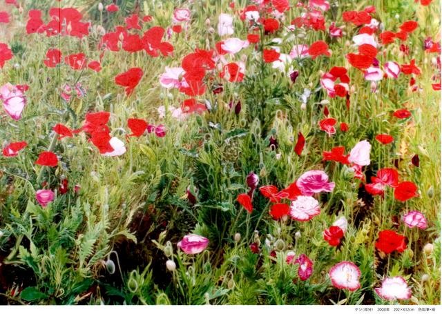 「ケシ2008」(左上図)という作品で、その一部(右図)と並べて見てみましょう。こんなのが、色鮮やかで細密で美しい花の絵として人気があったのか。たしかに、ケシの紅は鮮やかだし、細かく描き込まれています。しかし、どこか見慣れた現実の風景とは、何か異質なものに映るのです。どこか毒々しいというのか、不気味というのか、少なくとも、この花をみていて心和むとか、美しく愛でるということは、私にはできそうもありません。それは私の主観的な好み故なのかもしれませんが。ケシの紅が茎や葉の緑色から浮いているような、というより紅と緑が異なる次元にあって、それを透かして断面でみているような感じがします。まるで、視界の色の要素を積分しているようなのです。それは、現実に隠された真実の姿といったようなものとか、現実を拡大鏡で覗くとこんなようになるとかいったようなものではなくて、そんな生やさしいのではなく、異様で不気味なのです。