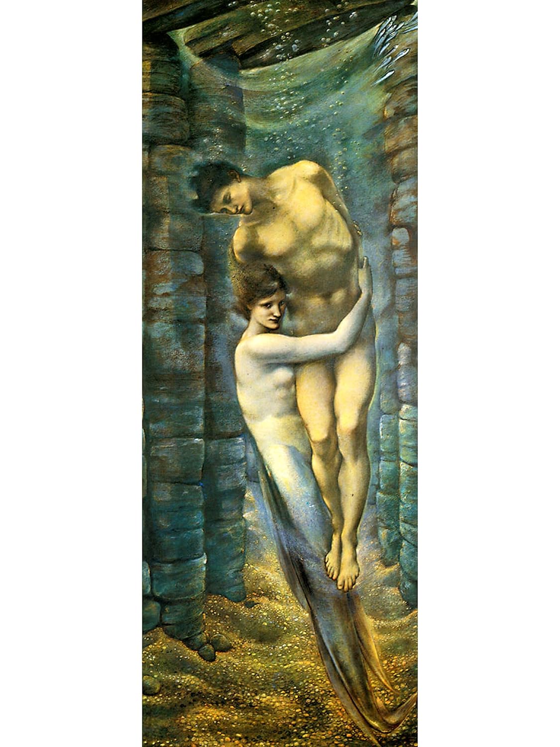 この一瞬とは、今まさに破滅しようとしている瞬間です。それを沈黙と静止の場面にして描いているのは「眠り姫」や「アヴァロンのアーサー王の眠り」と共通しているところです。その共通点というのは極めて重大な事件の起こる間際の人間です。しかも、これが性体験の含みがあると思われます。この「深海」では、この一瞬というのがセックスの直前の状態であると言えると思います。犠牲者たちは純潔の状態ではなく、迫り来る出来事に気づくその瞬間、つまり、そこに暴力的なものの含みがあると言えます。人魚は男性の体に抱きつくようにしがみついていて、彼の胴体の周りの彼女の腕の致命的な握りは、彼の肩の周りの彼女の髪の蛇のようなねじれによって補強されています。そして二つの体はとても密接に絡み合っているのでそれらはほとんど一体化したように見える。一方男性は、手足を縛られたように、両手は胴に貼り付くようになり、両足はしっかりと圧迫されているように開くことなく足先まで揃えられています。まるで人魚の尾鰭に倣っているかのようです。また、暴力的というのは、男性は明らかに人魚の支配下にあって、人魚の表情には笑みが浮かんでいることから、そこには男性を獲得したこと、支配していることの満足といったことが表われていると思います。
