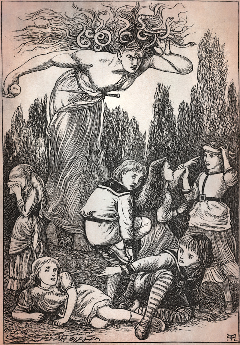 この分野の最高傑作といえるものはジョージ・マクドナルドの「At the Back of the the North Wind」につけた挿絵であり、「Good Words for the Young」に表われています。これらの大きく区切られたデザインは、贅沢に渦巻く髪の毛や洗練された特徴といった、ラファエル前派の様式を見慣れない未知のものに変えて、「the Beautiful Lady」(右下図)の子供の視点を伝えています。マクドナルドの物語の視覚化は叙情的で、非常に想像力豊かで、激しい、彼の最高の作品であり、ヴィクトリア朝の挿絵の傑作のひとつと言えましょう。