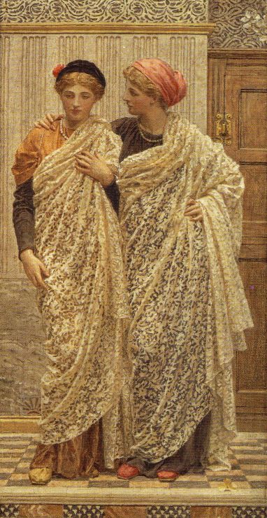 1860年代には、ファエル前派の一員であるモリスの紹介でモリス・マーシャル・フォークナー社でタイルと壁紙とステンドグラスのデザイナーとして活躍する一方で、またギリシアや英国内で壁画家として活動しました。そのなかで、彼の作風は徐々により古典的で審美的なスタイルに移行しました。1865年、彼は「マーブル・シート」(右図)をロイヤル・アカデミーに出品しました。これは歴史や文学を題材とした物語要素のない、純粋に装飾的な絵画でした。襞のついた衣裳を素肌にまとった着衣の人物像と裸体像を描いた作品で、ムーアの代表作といえる作品です。これ以降、ムーアは装飾的な作品のみに注力していくことになり、その姿勢は終生変わりませんでした。 (2)アルバート・ムーアの作品の特徴 アルバート・ムーアの絵をひと言で言い表すことはさほど困難なことではないです。浅い装飾的な画面の中に、一人(または複数)の古代風の衣裳を身につけた女性が無表情に佇み、あるいはまどろんでいる。こういえば、おそらく彼の作品中からこれに当てはまらない絵を探す出すのが難しいと言っていいほどです。彼の作品の技術的な点では誰もが認めていたのですが、このようなスタイルに対して、人々の好みは、はっきりと分かれていたようで、非難する側は彼の作品には主題の欠如が内容のなさと受け取られて、絵がかれている人物に明確な表情がないため人間的な共感を得られないというものでした。その他に、古代の生活を題材としていながら時代考証が明らかに間違っているというものでした。 しかし、裏を返せば、アルバート・ムーアという画家は、美しい人物を美しい状況に置いた画面を美しく描くということのみに集中し、他の要素、例えば、主題とか知識等の情報とかは夾雑物として排除していったと言えます。その結果、彼としては、これしかないというパターンを執拗に描いた。 彼の作品タイトルを列記すると「マーブル・シート」「きんぽうげ」「アザレア」「夏の夜」「稲妻」「ふたりづれ」というような、とってつけたようなものばかり。これらのタイトルは、作品の完成後に付けられたもので、まず主題にもとづいたタイトルがあって、そにしたがって描かれるのではないということ。したがって、まず描くことから始まって、後からつけられたタイトルは作品中に何気なく付随的に描かれた物からつけられたりと、どうでいいような、単に作品の区別がつけばいいというものでした。しかし、ムーアの立場からは、タイトルはどうでもいいどころか、そこに残された主題という不純なものの残すカスを払拭するために、意図的にそうしていると言えるのです。 タイトルに象徴的な表われていますが、美しく描くということがまずあって、主題などはむしろ邪魔であるということは、作品の画面の内容ということ、つまり、何が描かれているかという対象に何らかの意味があるということも必要ではなくなってきます。つまり、作品の画面の中の人物も花々も、調度や陶磁器なども、すべてが色彩と画面の構成の調和のための要素として配置されていると言えます。例えば、人物は表情やポーズから一切の感情表現やダイナミックな躍動感を排除するために、無表情あるいは眠りこける女性像を描き、単に立っていたり座っているだけの動きのないポーズで描かれています。これは、目や口や身体が表情豊かに語りかけるようであれば、人物を活写した人物画で、それは装飾的に美しくなくてもいいものです。ムーアの様品では表情を遮断したまま佇み、あるいは眠りこけるとき、人物は周囲の花々や調度類と等価な画面の構成要素となります。このとき、感情表現や躍動感の表現は、作品の純粋な美的の調和に対して邪魔だったからです。だから、主題がないとか人間的な共感ができないなどの彼に対する非難は、画家自らの意思でやっていることなのです。