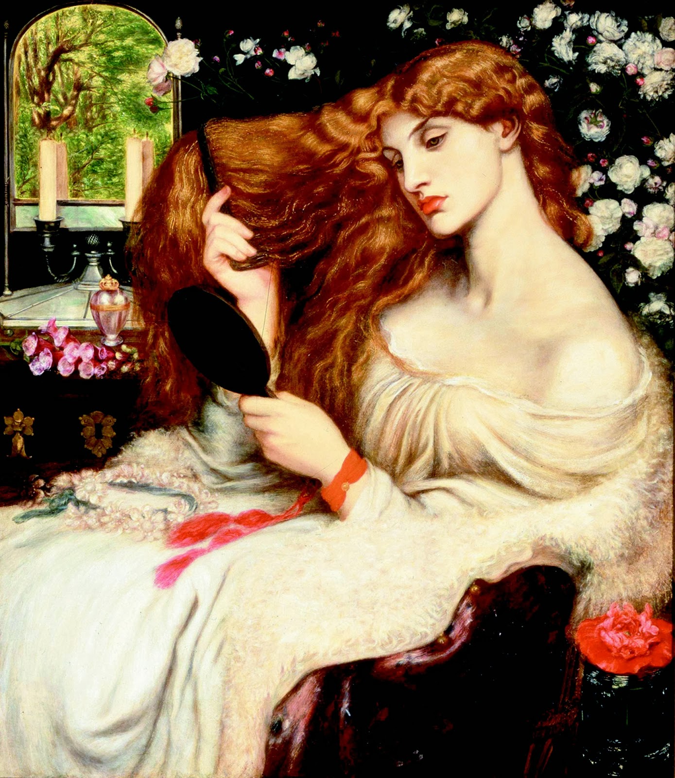 ブロンドの織り交った縮れ毛を見つめれば 愛は網を絡ませわたしの心を虜にする 時には真珠の数珠を餌に 時には薔薇一輪を挿し というように、韻文には誘惑する女性像の萌芽としてロセッティが惹かれる所があったと思われます。この韻文は特に見るという行為を強調しています。男性の詩人は自分自身が女性の美しさに魅了されていると宣言していますが、女性は自分の相互観察の結果としてのみこの力を発揮することができます。アウレリア(その名前はおそらくその古典的な意味合いのために選ばれた)は彼女の赤い唇、流れる赤い髪と露出した肩と首によって画面で強調された強力なエロティックな魅力を醸し出しています。奥行きの浅い空間の中で、欄干を前にして、手前に櫛、香水瓶など、贅沢な化粧品が並んでいます。鏡に映る自身の姿に見とれる彼女の夢のような表現は芸術家の視線の対象です。 男を破滅に引き摺り込む女性への嗜好