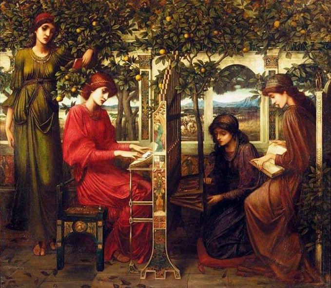 Days」は、イギリスの美学運動の中心的なテーマの一つである、音楽の主題によって喚起される音の感覚を含んでいます。この作品は、同じように音楽を奏でる少女たちのグループを描いた1901年の「Summer